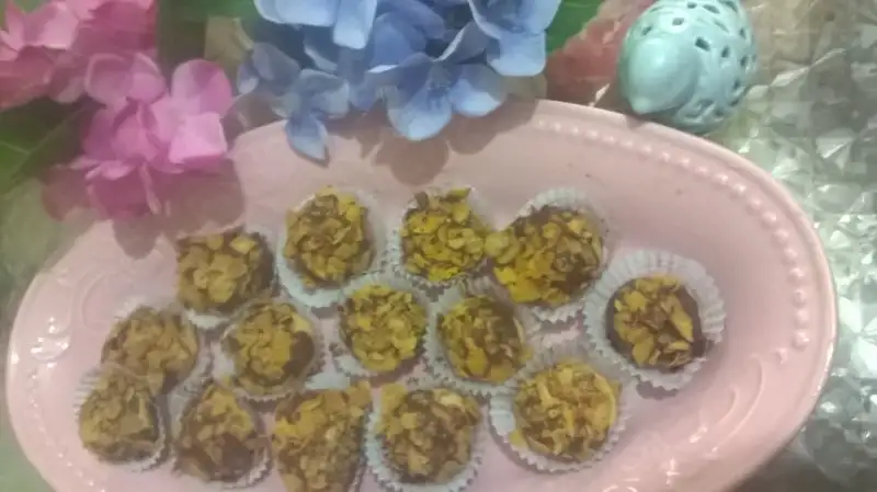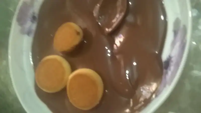 İlk sıcagı geçmiş çikolata alınır.kurabiye önce çikolataya sonra mısır gevreğine batirilir.Servise hazir!!!