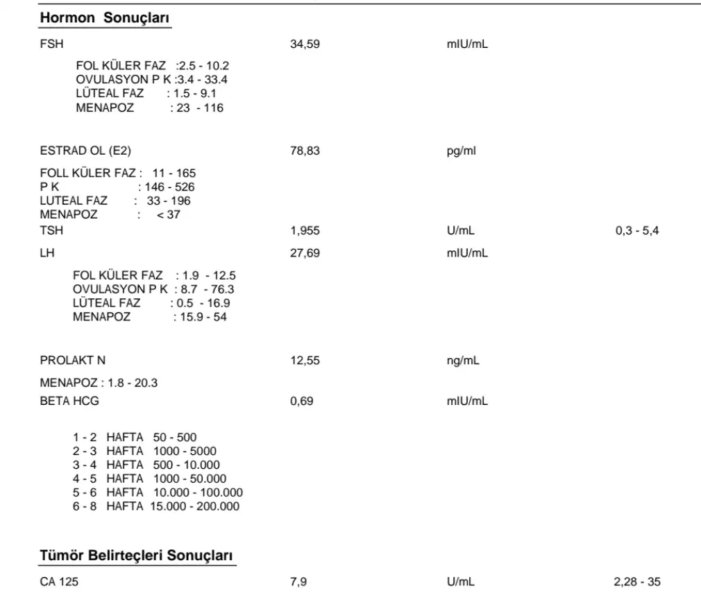 Evet fsh ve lh çok yüksek lh de 27 fsh 34 prolaktin ise 12 .55 cikti bir de sol yumurtalık kisti var CA 125 de 7,9 cıktı. Bu durumda hamile kalmam zor değil mi 😢 fsh ve lh yuzunden. Progesteron yazmıyor bende bakılmadı mi acaba o neyse bilgim yok. Çok bilgi sahibi değilim bu konuda 2 gündür öğrenmeye çalışıyorum. Yanlız bana adetliyken yapilmadi bu test adet olamıyorum gecikti bat tarihini 30 gün geçti o şekilde bu değerler cıktı. Doktor adetliyken yapalım filan demedi