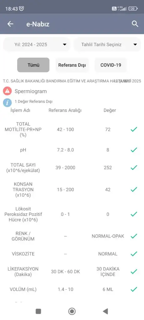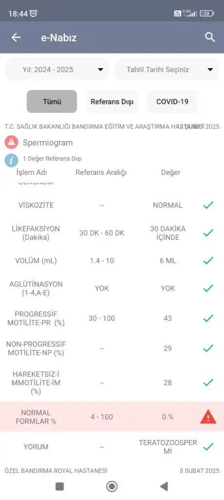 Malesef test yok eşimin e nabizinda gördük sonuçları oda işte şuan ama diger değerler normal çıkmış hatırladığım kadarıyla bide ileri harektsiz olan %28 di sanırım sadece morfoloji referans dışı çıkmış gösteriyordu çok korktum ağlıyorum aksamdır 😔