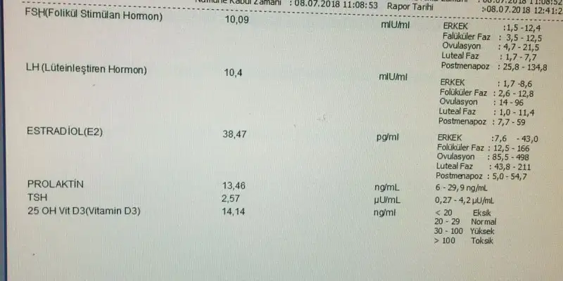 Canım hangisi bugün yaptırdığın test anlayamadım ama sanırım vitamin dye bastırdığın test diye tahmin ediyorum. Vitamin d genelde herkeste düşük oluyor takviye alırsın. Bütün değerler sınırlar içinde. Bence bir problem Yok ama diğer test de fsh göremedim birde birinde e2 60lsrda çıkmış. 50ye kadar iyi ama üzerine çıkınca problem mi bilmiyorum. Sınırlar dahilinde endişelenecek birşey Yok.