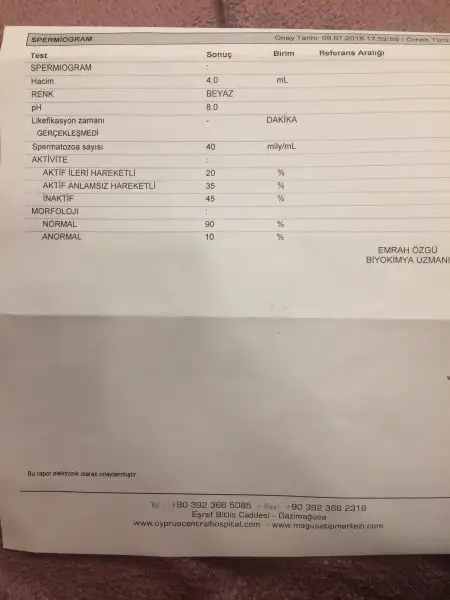 Ml de 40 milyon toplamda 160 milyon sperm var. Normal sprem %90. Anormal %10. Sayı fena değil iyi sayılır, arttırılsa fena olmaz. Hız da kötü değil ama en az %32 olmalı diye biliyorum.