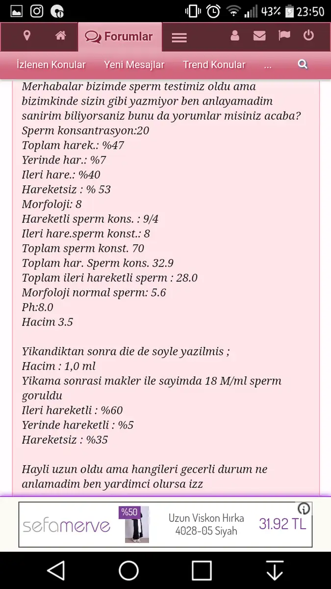Hoşgeldin yanıma. Eşinle eşimin değerleri o kadar benziyor ki bizimde başta böyleydi. İleri haraket %7 gerisi haraketsizdi sizde yerinde haraket de var. Yapmadığımız şey kalmadı bir tek sayı yükseldi tüp bebeğe başlayacağız. Bende pcoluymuşum ama her ay adet oluyorum. Ama bu seni korkutmasın bu değerlerde olup düzelen çok kişi var. Bizim nasipte yokmuş düzelmedi.