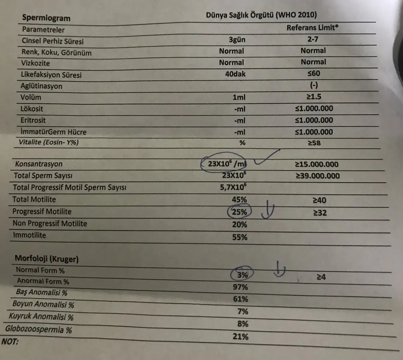 Merhaba kızlar ben pcoluyum ama sadece görünümü var adetlerim düzenli kilom normal tüylenme yok 8 aydır olmuyor henuz hamile kalamaadım eşime test yaptık sonuç aşağıda eşim sigarayı bıraktı doktor değerler çok kötü dwğil ama sigara içme beslenmene vw uykuna daha dikkat et dedi klomen ve 15 günde burulan bir iğne verdi 2 ay sonra tekrar test yapılcak bunun yanında biz özel arıs ütü polemin bal karışımlı bir macun hazırlattık ve keçiboynuzu kürü yapıyorum sabah akşam sizce sonuçlar nasıl ve daha başka önerebilceğiniz birşeyler varmı