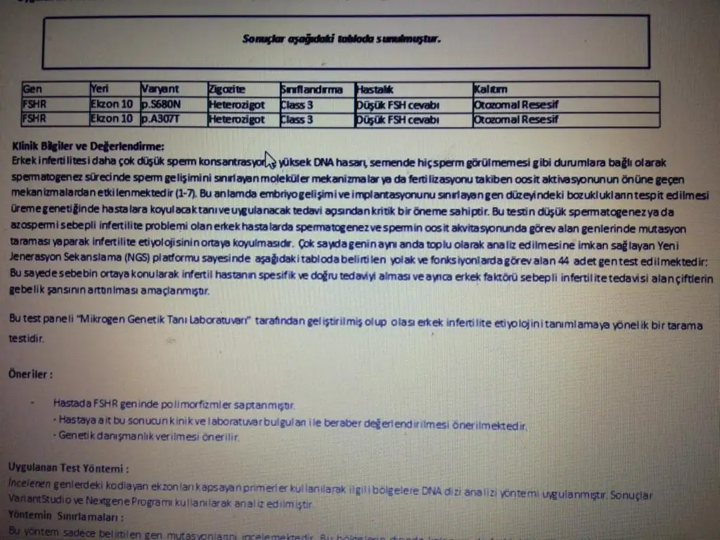 Mrh bizimde dun cikti infertilite panelimiz bizim 3 gende sıknti var ikisi fshr sizinkiyle ayni claass3 grubunda ama sonuclardan hicbirsey anlamadik ayin 23 u kaan hocaya gondercez ins.duzeltilebilir faktorlerdir.panel hakkinda bilgi edinirseniz benide bilgilendirebilirmisiniz sonuclarimiz ayni cunku.bilgilendirirseniz cok sevinirimmerhaba eşimin erkek infertilite kan sonuçları ve dna hasar testi ile ros testi sonuçları çıkmış erkek inf sorunlu gibi bilen anlayan varsa yardımcı olabilir mi