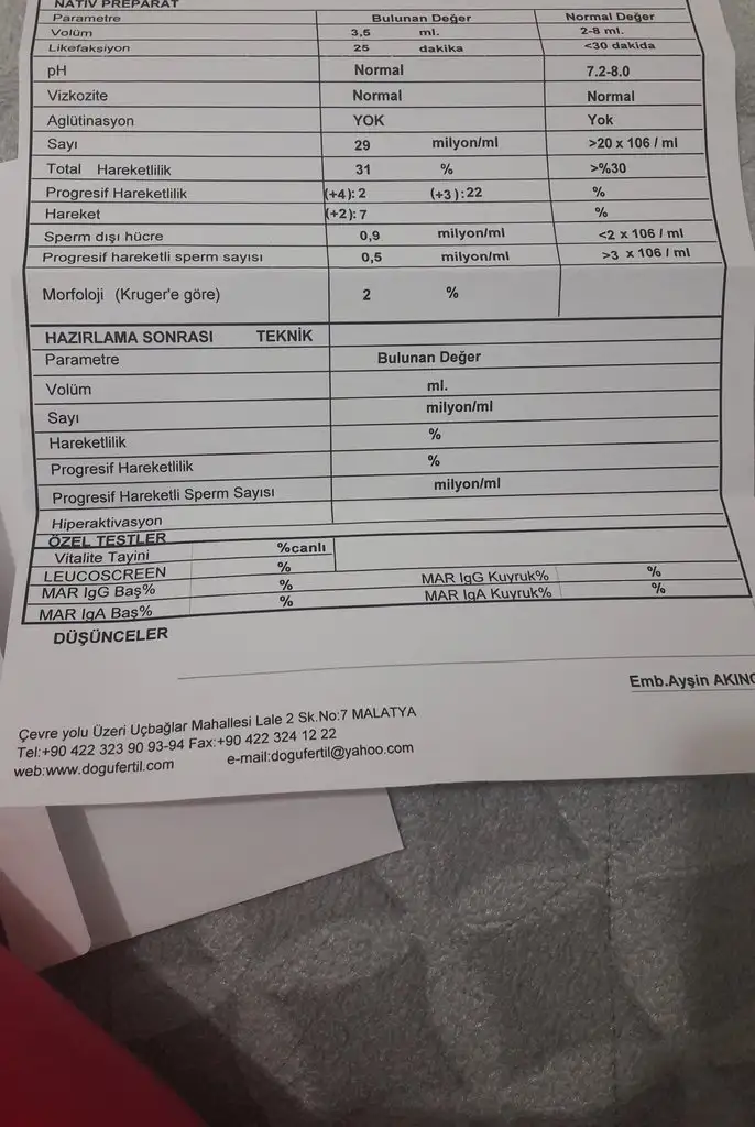 benm bildgm sayiniz ml de20 milyn dan fzla ama artirabilr hizinz fena degl morgolji 2 bu deger bzmde ole cikyrz .yani bzm sayimiz dha fzla ma gene gbelik olmyr morgolji sebb olyr belki ozmn. Degrlnz kotu dgl iyilestrrblr .kac yildr evlisznn cocuk istyrszn ona gore beklyp vitaminlrle desetklyblr yda tüp bbek dusunblrszn bna gore 1 yil kndilignden olmaysa beklemk vakit kaybiyms canm .Arkadaslar eşimin semen analizi bu konuda hiç bilgim yok olan yardımcı olabilir mi henüz doktora gösteremedim çok merak ediyorum bi akşam aldik sonucları sperm sayisi ve morfoloji normal mi.hareketlilik birde yardım arkadaslar
