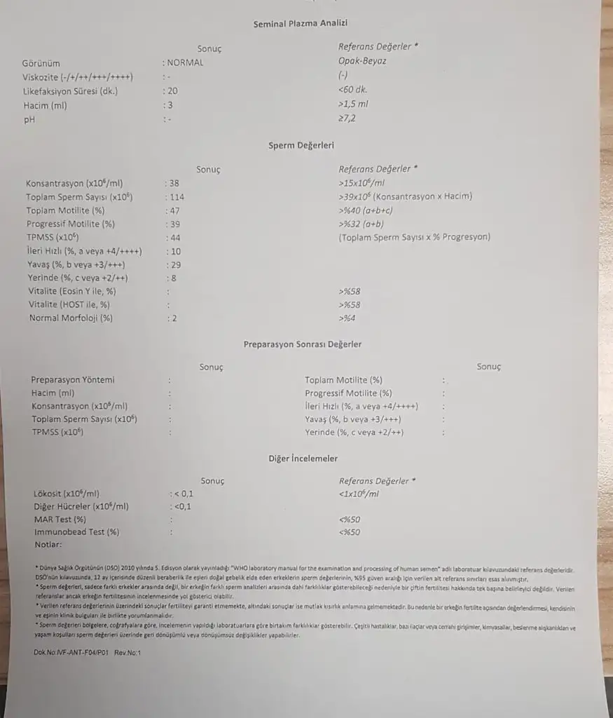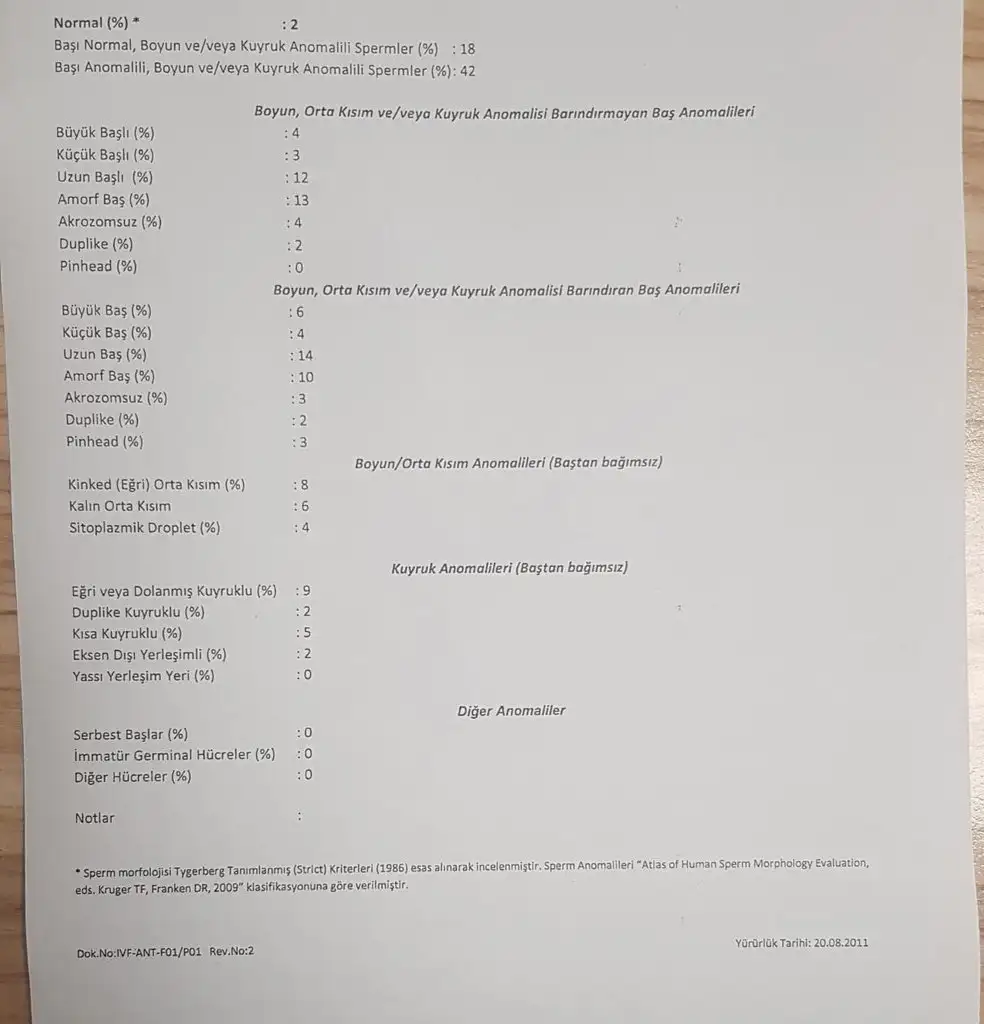 Morfoloji kısmını bilemyrm ama sayı ve hız gayet iyi,ileri hız için havuç kürü yapablrsnz.Bence kürlerle deneyin normal yolla hamile kalmşsnz tekrarı neden olmasn :)Kızlar merhaba. Yardımınıza ihtiyacım var geçen sene mayıs ayında hamile kaldım ve 6 haftalıkların düşük yaptım. 6 aydır deniyoruz hamile kalamadım. Bende fsh yüksekliği var. Bu ay eşimde test verdi. Hiç beklemediğimiz bir şeydi. Test sonuçlarını da eklicem. Ne yapmamız lazım doktor emodex verdi .3 ay kullan dedi ama her ay test verecek. Hamileliğe engel değil doktor ama bilemedim. Yumurta rezervimde azalma var sizce beklemeden aşılama yada tüp bebek mi yaptırmalıyız. Bu değerlerle hamile kalanınız var yardımınıza ihtiyacım var