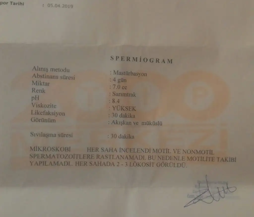 Merhaba, sonucu gönderin isterseniz, sayıya hiç mi bakılmamış anlayamadım.İyi Akşamlar hanımlar yazılanlari okudum ama anlamadım 3 ay önce spermiyogram yaptırdık nadir yavaş hareketliydi ama sayı % falan yoktu 1 hafta önce yaptırdık hiç yok varoksel yok fsh 24 diğer hormonlar normal egitim araştırmaya gitmek için bekliyoruz fakat merakım ilaçla tedavi yeterlimi doğal yolla hamilekalma şansım var mı ?