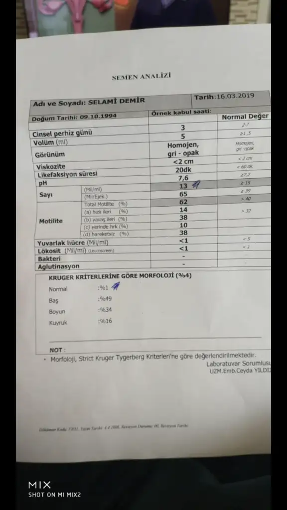 Kızlar bende aranıza katılayım o zaman . Eşimin morfolojisi 1 çıktı sayıda 13 milyon varikosel ameliyatı oldu 25 gün olacak işte . Kafamdan atmaya çalışıyorum ama beynime kazındı resmen hamile olabilecek miyim diye . Eşimin ameliyat öncesi sperm sonucunu ekledim bakabilirsiniz 😔