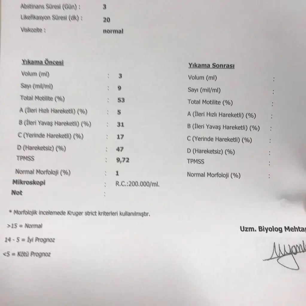 Yaklaşık 15 gündür keçiboynuzu kürü kullanıyor eşim ama içine keçiboynuzu pekmezi de katıyoruz çünkü sade içemiyo ne yapmalıyım nasıl yapmalıyım hiç bı fikrim yok baya bı bunalmaya başladık eşim de bendeEşinizin değerleri şuan yumurta takibi veya aşılama kadar iyi değil. Para harcamayın o tarz şeylere. Takviye kullandırın. İleri haraketli %30un üzerine çıkması lazım. Bu değerler kötü değil ama referansın altında hareketlilik ona biraz yoğunlaşın. İnşallah normal yolla hamile kalmaya yetecektir.