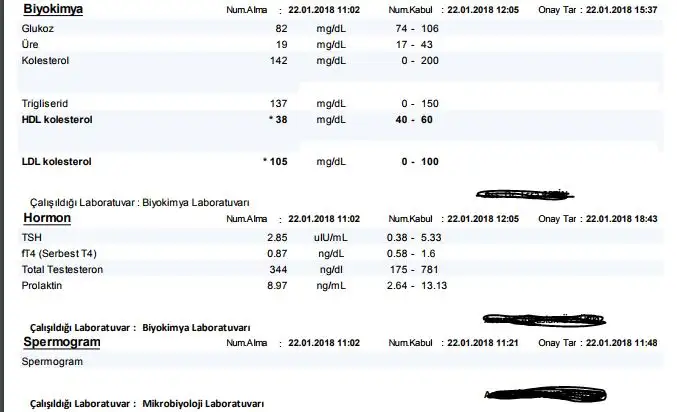 Yetişkin olan erkeklerde testosteron değeri, 280-1100 n/gdl arasında olmalıdır.