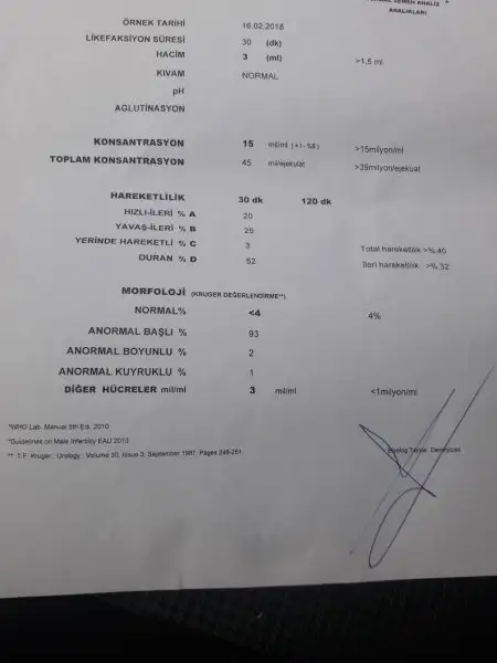Hızınız orta derecede yanı çok kötü değil iyiye yakın,sayınız olması gereken sınırda sınır ml de 15 milyon morfoloji yani şekli düzgün sperm sayınızı göremedimTest sonuçlarını paylaştım rica etsem yorumlarmısınız anlayan arkadaşlarmerak ediyorum da