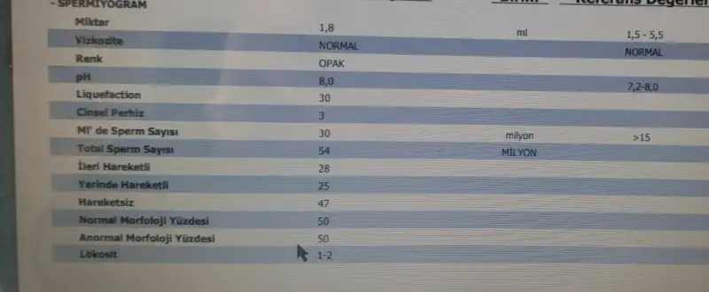 Toplam sperm 54 milyon %28 ileri haraketiniz varmış. Spermlerin yarısı düzgün yapıdaymış. Sonucunuz kötü değil normal değerlere çok yakın olmakla birlikte çok az vitamin takviyesi yapılabilir %25lik yerinde hareketli spermler haraketlenir şansınız da artar. Keçiboynuzu kürü de yapabilirsiniz. Çok geçmiş olsun.