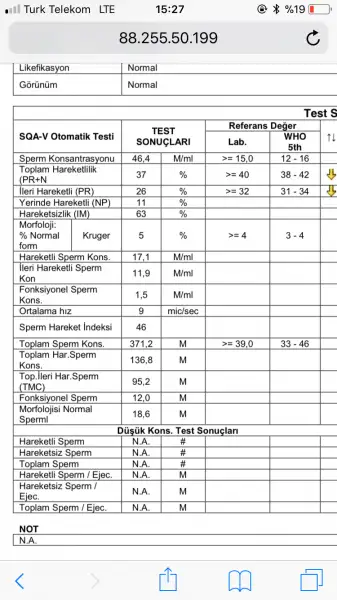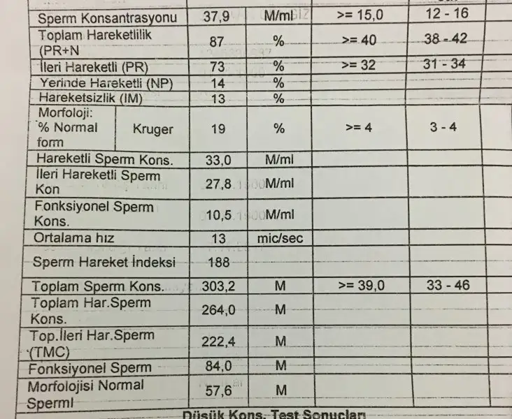 Doktora gösteremedik ama netten bakıyorum morfoloji yüzde 20 ve üstü normal kabul ediliyor ama bizde yüzde 5 çok moralim bozulduCanim ben sorun goremedim. Ml deki sperm iyi ,morfoloji 5 cok iyi ,hareket de iyi sadece bir tik yukseltilebilir .Bu da basit bir sey .Gozumden kacan baska bir sey var mi bilmiyorum .