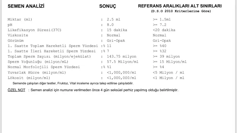 Ozaman duzelme var diye bilirizViskoziteyi hep yüksek çıkıyordu bu kez normal çıkmış. 43 milyon spermin üzerine hiç çıkamamıştık. 143 milyon olmuştu. Toplam haraket hiç %7nin üzerine çıkmamıştı. %11 olmuş. Bir de 40 milyonun %7si ile 140 milyonun %7si arasında fark var diye düşünüyorum. Kaan hocadan cvp bekliyorum şimdi.