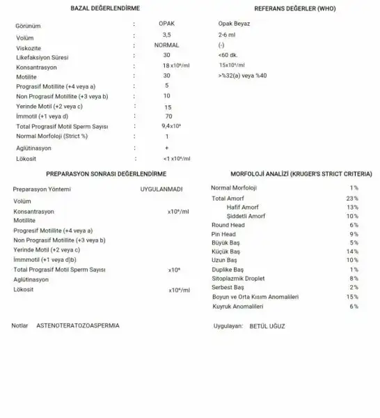 bızım cok düşüktü tup bebek dedı dr baska turlü olmaz dedı 5 ay korunmadık 2 ay yaptım kür esıme ınan yogun calışıyorum bırde ev işbırde bu test sonucu benı cok üzdü fakat yılmadım üşenmedım hiç her aksam uyguladım eçi boynuzu pekmezi keci boynuzu kürü bırde coban çökerten cayı aldım uyguladık eczanedende vıtamın tozu aldım 1 ay kullandı eşim bu ay hamıle oldugumu öğrendım o çift cızgıyı gördüm cok dua ettım ınandım rabbıme sende yap vede hergun dua etSagol canim keciboynozu ozu kullaniyoruz