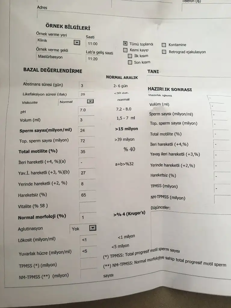 Merhaba şimdi sizin sayı ml de 24 ama morfolojiniz %1, ben buradan basit bir sağlıklı (morfolojik sorunu olmayan) sperm sayısı çıkarımı yapmaya çalışmıştım. Sizde de bu durumda 1 ml sperm örneğinde 240000 kadar sağlıklı sperm var görünüyor. Eşinizden bu geldiğinde birinin sağlıklı dölleme oranı okadar da düşük değil yani imkansız bakmayın demiştim arkadaşa size de öyle diyorum ama işte hareket sorunu var sizde yani bu 1 ml deki 240000 sağlıklı spermin sadece 84000 tanesi hareketli onlar da yavaş maalesef. Bu durumda sorun şu ki, doğal yolla bunların yumurtaya zamanında ulaşıp zarı delip dölleyebilme olasılıkları ciddi oranda düşüyor.Merhaba bizim sayı