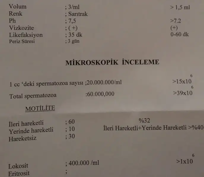 Kizlar merhabalar esimin bir ay onceki ve bir ay sonraki tahlillerini paylasmak istedim yaklasik 20gundur keci boynuzu kuru pekmezi ve e vitamini veriyordum meraktan bugun tahlil yaptirdik sayida ve ileri hizlida artis gorduk 20gunde bukadar iyi olmasina sasirdim umutlarimizi kaybetmeyelim morfoloji %2di en son bu tahlilde bakmamislar dr da cok onemi yok o strese bagli olarak inis cikis gosterebilir dedi bu degerlerle gebelik olur bi kac ay daha deneyin dedi henuz hamile degilim ama en azindan bir nebzede olsa icim rahatladi...bu kurleri yapmayan sayi ve hizda problemi olan arkadaslarimiz varsa bence bu kuru biran evvel uygulasinlar