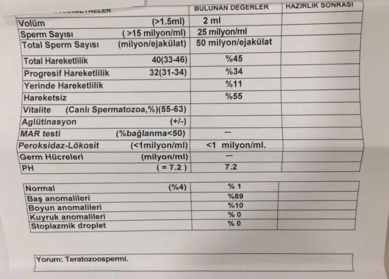 Tatlım sayınız iyi hızda da eski teste göre çok güzel yükselmiş. Sanırım lökosit yüzündendi hareketsizliği. Ama morfoloji problem bu topikteki hepimiz gibi. Baş anomalisi de yüksek. Dna hasarı baktırdınız mı hiç ? Yada varikosel var mı?