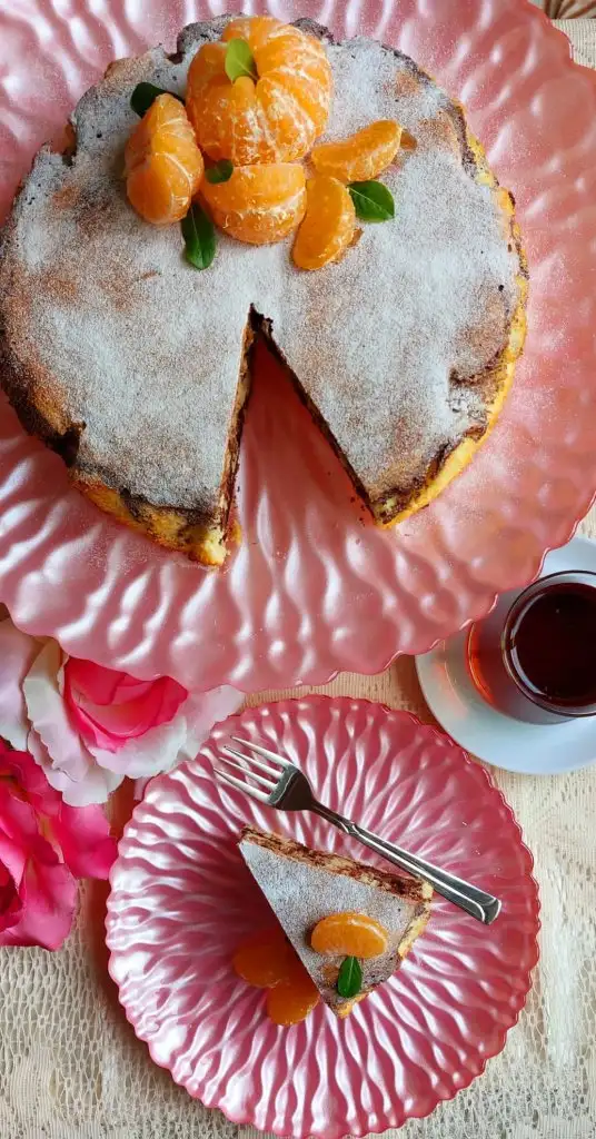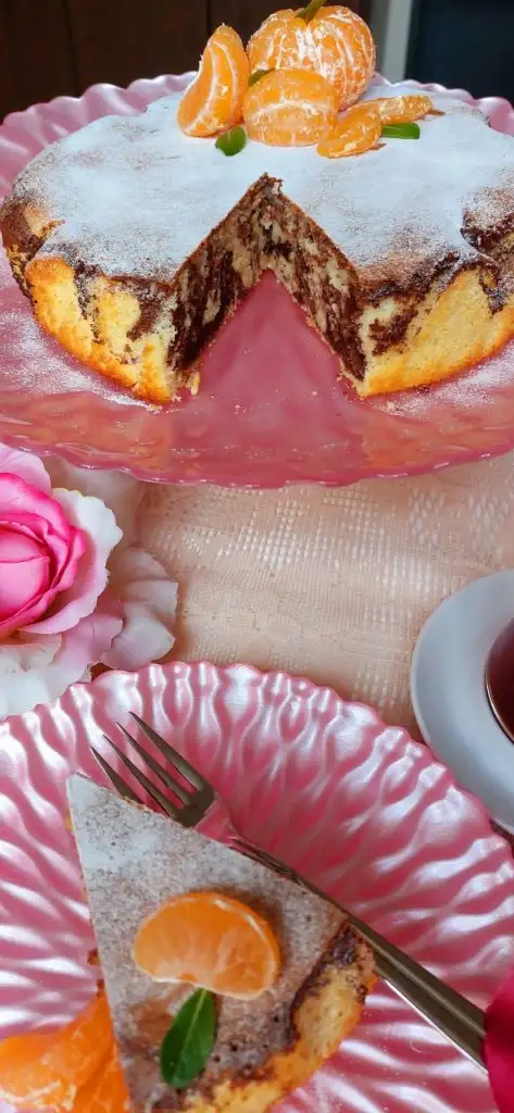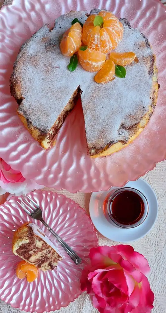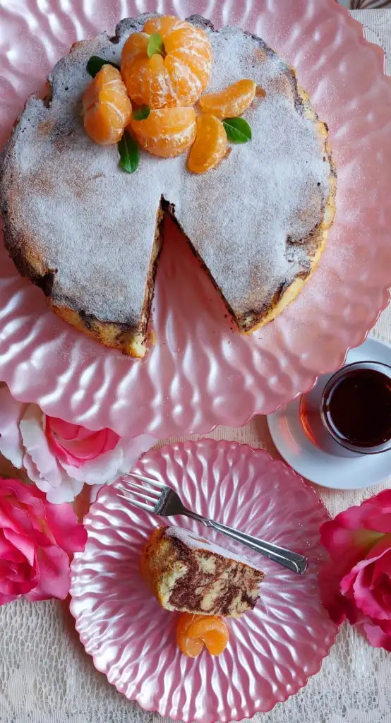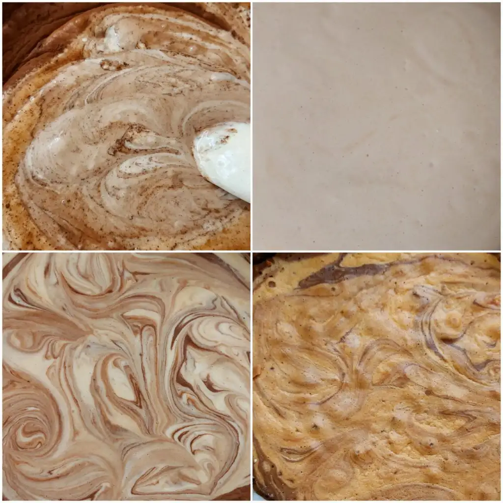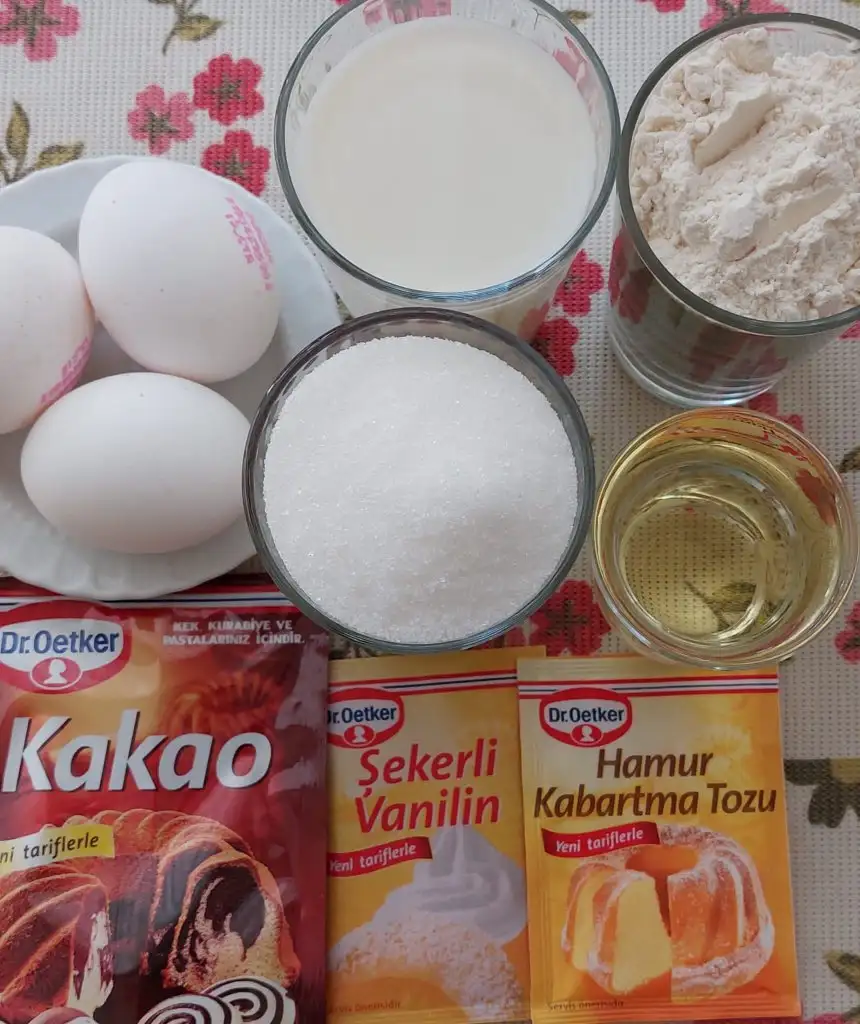 kek hamurundan biraz ayırip kakao ekleyip karıştırıyoruz. Kalıba biraz beyaz hamurdan döküyoruz. Üzerine kakaolu döküp karıştırıyoruz biraz. Sonra yine beyaz hamur. Önceden ısıtılmış fırında 160 derecede 45 dakika pişiriyoruz. Kürdan ile kontrol ediyoruz.