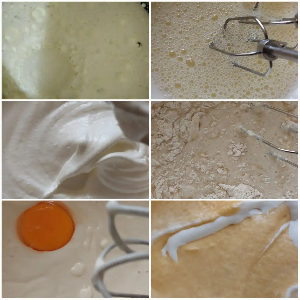 Süt ve yağı birazcık ısitiyoruz. Geniş bir kaseye bu karışımı alıp unu vanilyayi,kabartma tozunu eliyoruz. Yumurta sarilarini teker teker ekleyerek karıştırıyoruz. Beyazları farkli kasede bir fiske tuz ile çırpıyoruz iyice. Azar azar şekeri ilave ederek çırpıyoruz. Krema kıvamına gelecek. Hamur karisimina yumurta beyazını üçe bölerek ekleyip alttan üste karıştırıyoruz. Hamuru kabartıyoruz.
