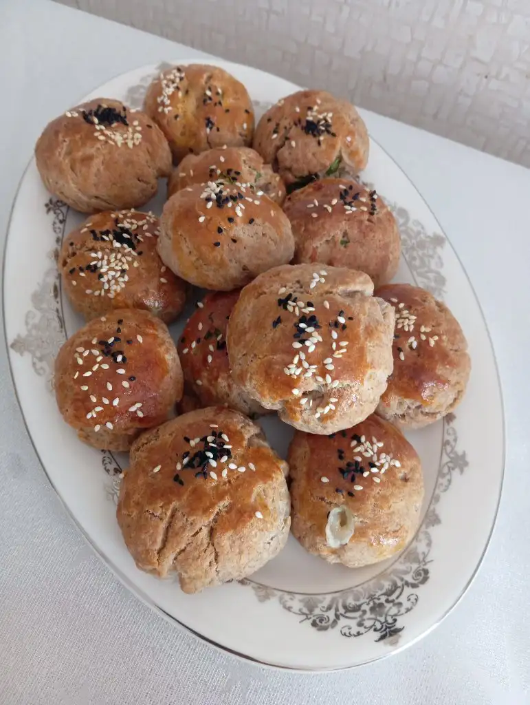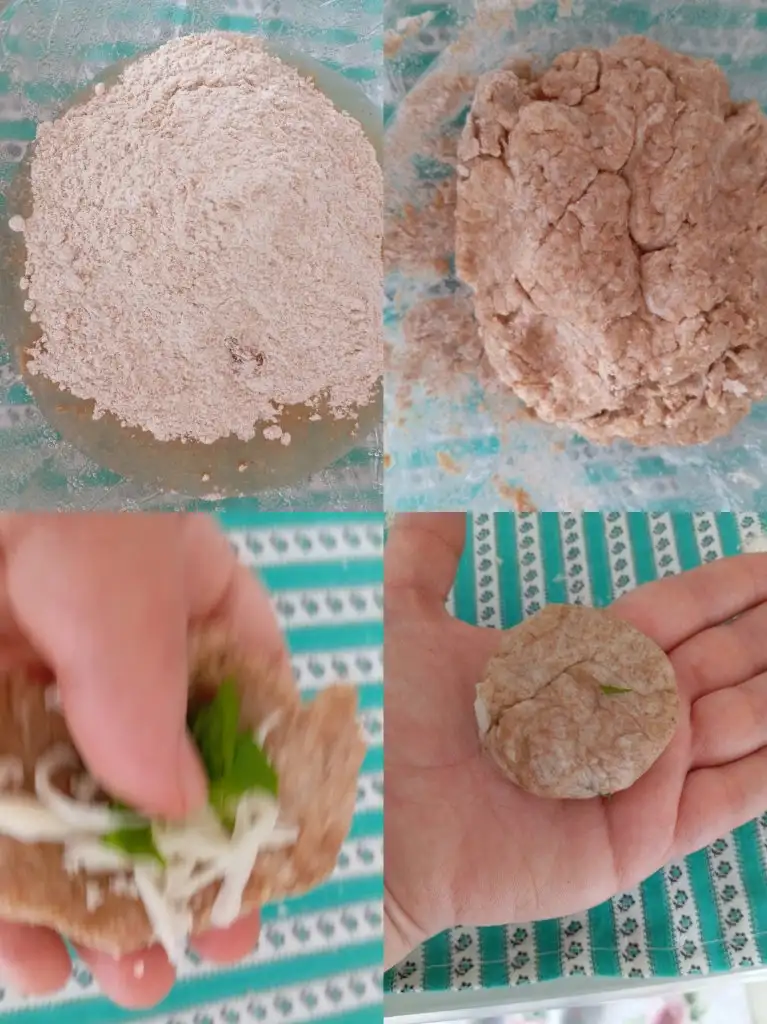 Katı hale gelince yuvarlak şekle elimde getirip içinede kaşar peynirli maydanoz harcını ilave edip hamuru kapatıp poğaça şekli veriyorum.