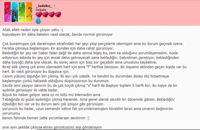 Şekerim sen yine sıkıntılısın hem okul hem duygusal manada. Yorucu bi döneme giriceksin bu sıralar okul yoğunlaşıyodur ama ona yordum ben. Bir arkadaşın var kız bu dertleşme gibi bi durum var oda sende sıkıntılısınız biraz ona anlatınca rahatlicaksın. Bu eskisiyden bi haber ver sana kaç faldır görüyorum ama böyle tekrar başlama tarzı olmayabilir duyumlar falan olabilir seni biraz üzücek hani. Klasik biliyosun bi için cız eder ya o tarz bi durum. Şekerim dileğin oluyo birinin yardımıyla ama sanki bu dilek istediğin kadar iyi olmicak bilemedim yani öyle geldi. İçini sıkma bu kadar herşey olcağına varıyo biliyosun bebek. Bana tarot açarsan seviniriiim kahve yükleyecek durumda değilimde şimdi:) bilgilerimi biliyosun bebek istiyosan özelden tekrar yolliyim. Sorularım iş ve bu yeni çocuk:)