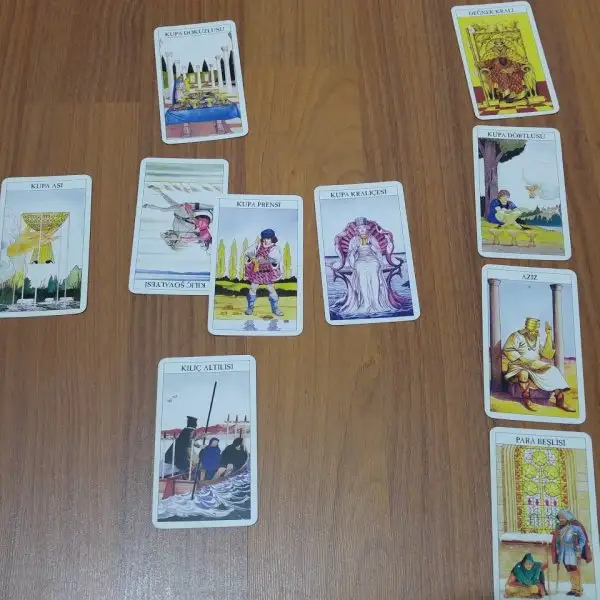 Kartların çok duygusal çıktı. Falında bir erkek var. Kova burcu olduğunu düşündüğüm bir erkek. Sana bir haber getiriyor. Sıkıntılı bir haber. Canını sıkacak bu erkek senin. Genç bir erkek olarak çıkmış. Ama bu haberin olumly bir yönü olacak evliliğinde. Yani eşini pozitif etkileyecek. Hani şer görünen de hayır vardır derler ya öyle.bir yere gidilmek isteniyor. Daha doğrusu gidilmiş ya da gidilmek üzere. Bir ayrılık çıkıyor. Biriyle bağlarınızı koparıyorsunuz sanki. Kartta bir kadın ve bir erkek gidiyor. Kılıç altılısı ama erkek gözü arkada kalmış. Görüyorsan. Eşin olduğuna yoruyorum. Eşinin aklı geride kalıyor. Ama bu ayrılık sayesinde aranız iyiyken daha da iyi olabilir. Çocuk var mı bilmiyorum ama bir çocuk düşünebilirsiniz. Kupa ası ve peşi sıra gelen kupa kraliçesi. Bunlar seni temsil eden kartlar. Duygusal olarak zirveye çıkacaksın diyeyim. Zaten seviliyorsun ama üstüne bir kat daha sevileceksin. Gerçekten tatmin olacağın bir döneme giriyorsun.maddi olarak bir sıkıntı çıkıyor. Bir süre bazı masraflar kısılacak olarak çıkmış. Aziz kartı ise sizi bu darboğazdan kurtaracak büyüğünüzü simgeliyor. Aileden biri baba, amca, belki de bir patron olabilir. Konum olarak iyi bir yerde çıkıyor. Saygı duyulan biri olarak çıkıyor. Eşinin parayla ilgili epey sıkıntısı var. Bir fırsatı mı kaçırmış bir şeyi mi reddetmii ne yapmışsa onu düşünüp duruyor. Ama asıl fırsatları görmüyor. Elinin altında daha iyileri var ama kafayı ona takmış gibi. Terfi durumu yada yükselme gibi bir şey olabilir. Eşinin konumu daha iyiye gidiyor. İş anlamında. Valla çok olumlu bir faldı. İnşallah gönlünd göre olur her şey