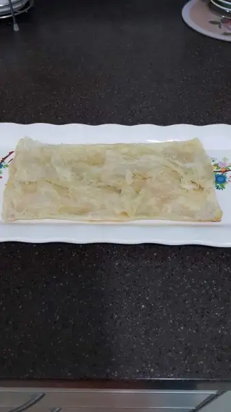Fırından çıkan milföy boyundan 2'ye kesilir,bir tabağa alınır..