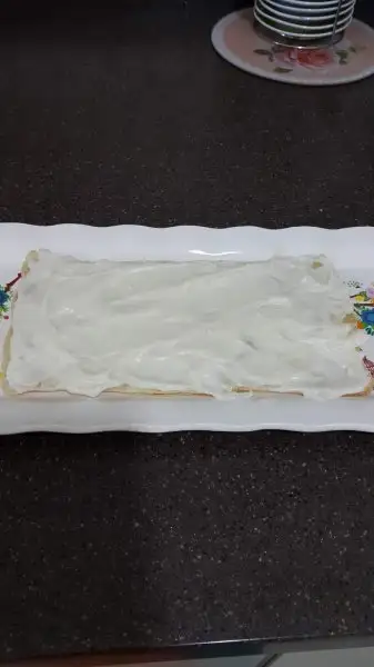 İkiye ayırdığımız milföyün üzerine yeterli miktarda muhallebi sürüyoruz.