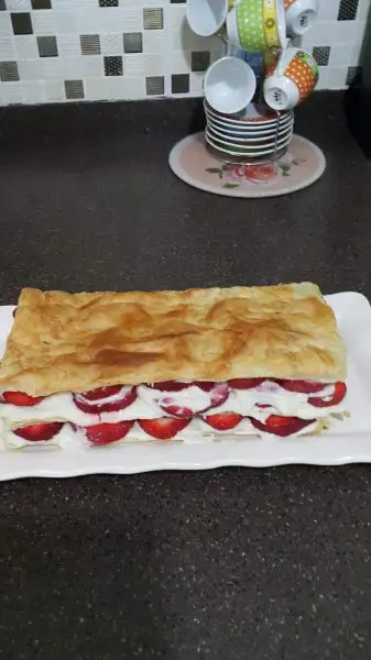 Daha sonra diğer yarım olan milföyü çileğin üzerine koyuyoruz.