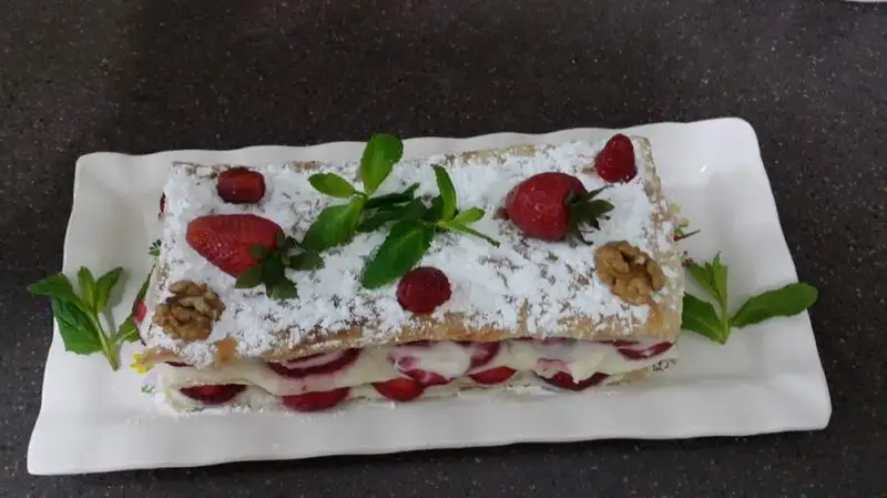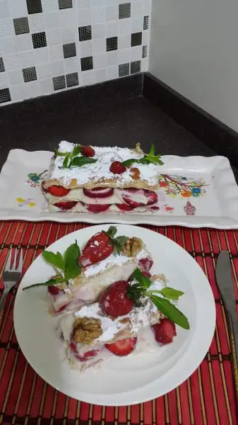 Milföyümüzün üzerine nane eşliğinde çileklerimizi yerleştiriyoruz..