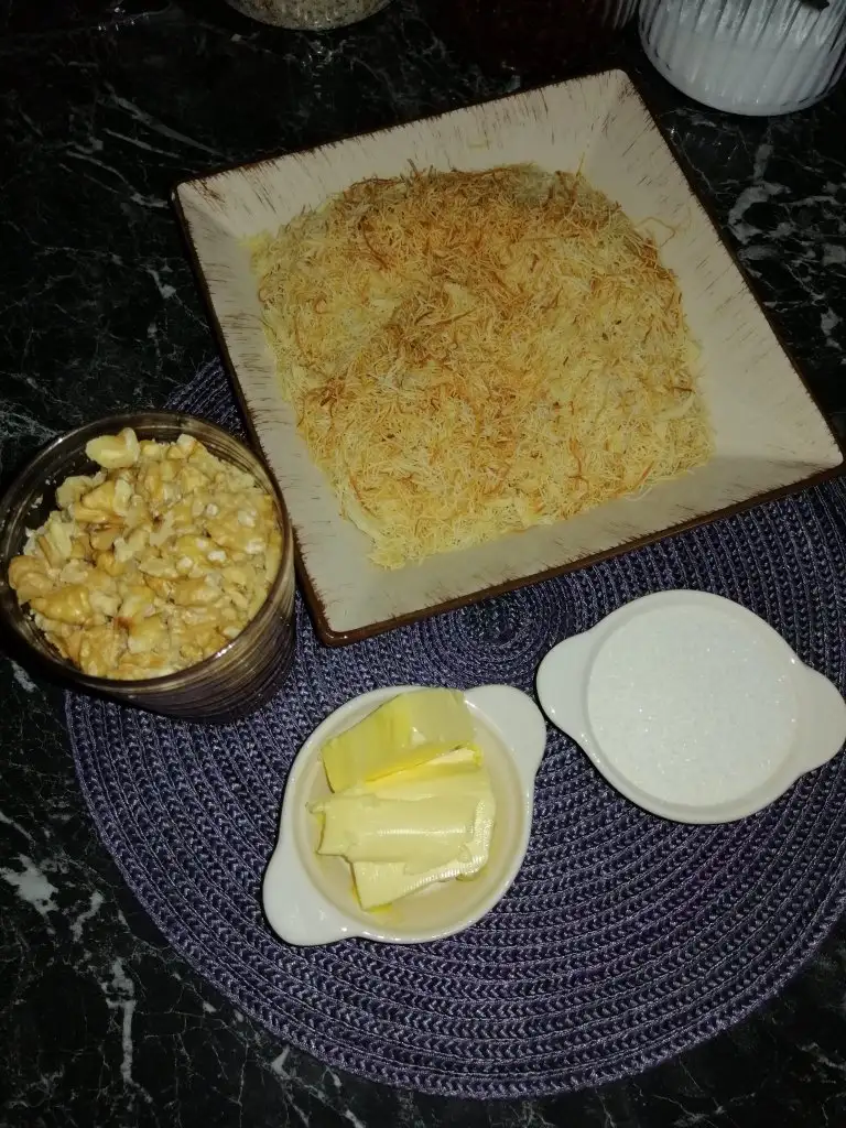 Çok basit bir anlatım yapacagımtavamıza ilk önce yagı alıyoruz vede eritiyoruz. Eriyen yağa şekeri ilave edip Bi iki tur karıstırıyoruz vede onu da eritiyoruz. Daha sonra kadayıf ve cevizi birlikte ilave edip biraz kavurup Bi kaba soğuması için alıyoruz.