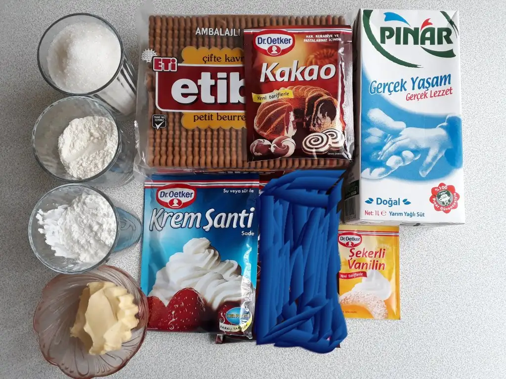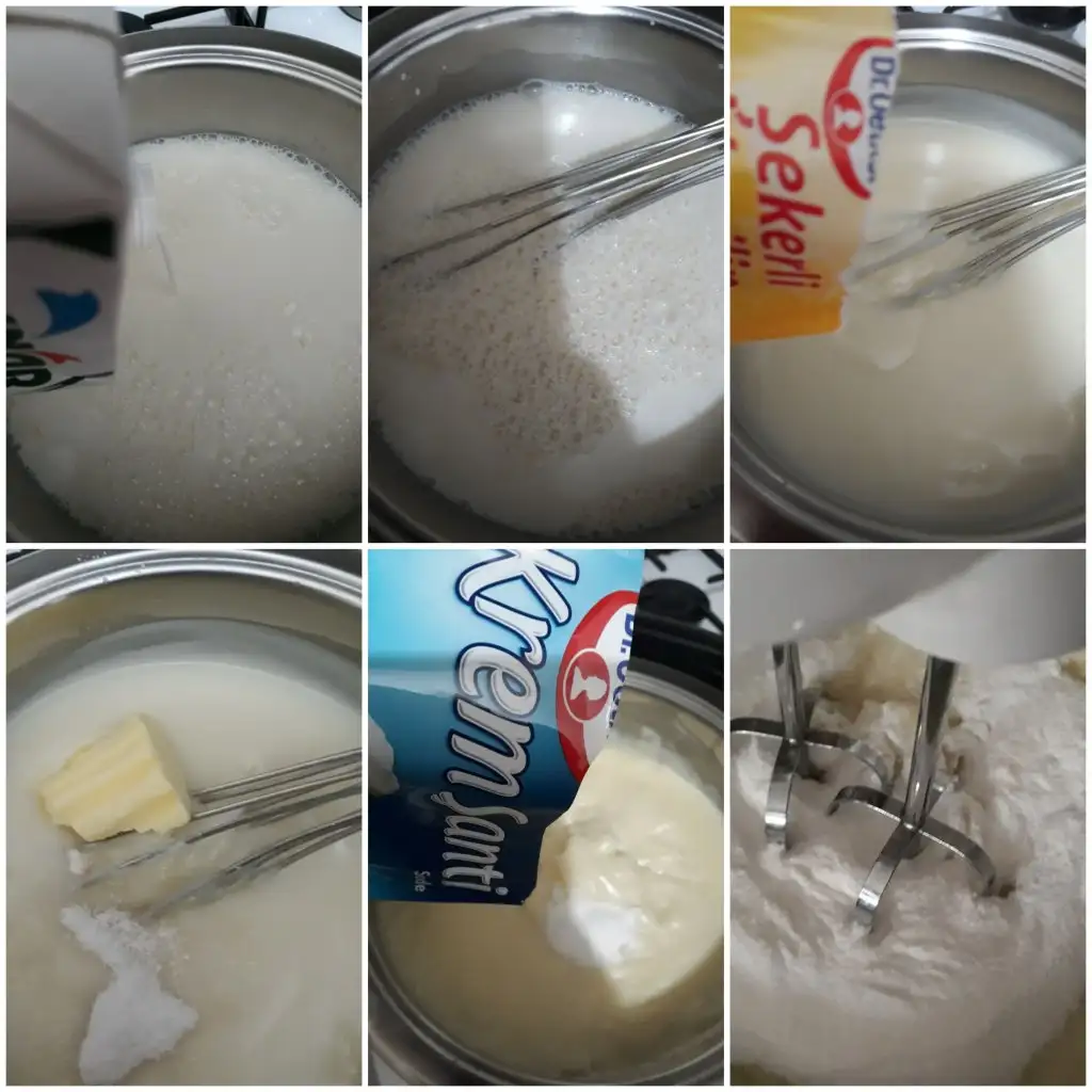 Bir tencerenin içine süt, un,nişasta, şeker koyup karıştırarak koyulaşana kadar pişiriyoruz. Muhallebi kıvam alınca içine tereyağ ve vanilyayı ekleyip karıştırıyoruz ve ocaktan alıyoruz. Içine toz kremsantiyi ekleyip mikser ile çırpıyoruz.