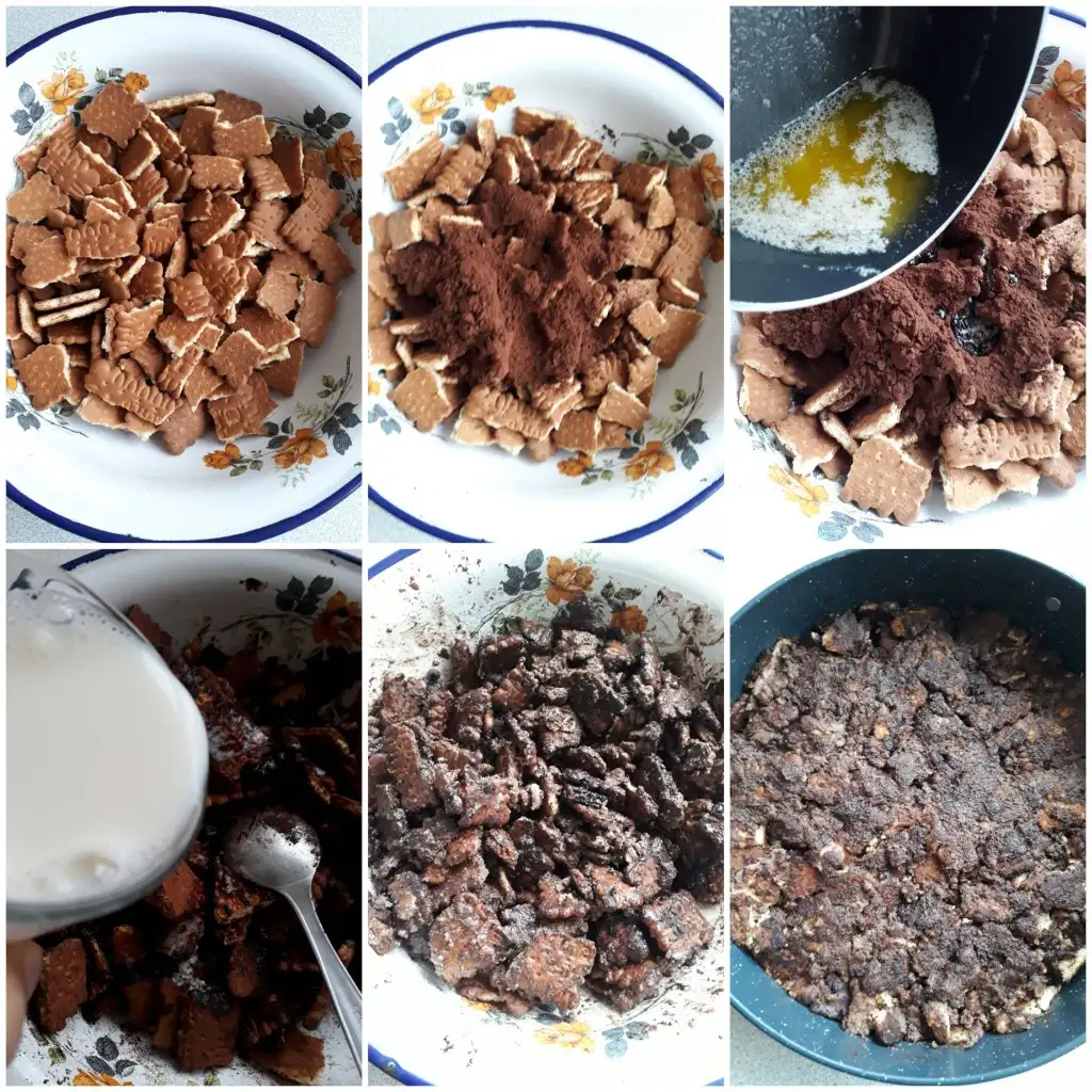 bir kabın içine bisküvileri çok ufalamadan kırıyoruz. Içine bir paket kakao, süt ve 125 gr eritilmiş tereyağını ekleyip çok kırmadan karıştırıyoruz ve kalıbın içine yayıyoruz. Ben kalıba kağıt sermedim isterseniz pişirme kağıdı koyabilirsiniz.