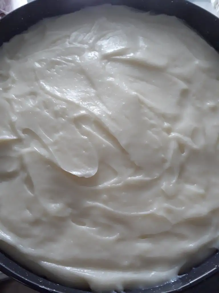 Muhallebimizi kalıptaki mozaik pastanın üzerine döküp yayıyoruz. Ben bir gece dolapta dinlendirdim iyice soğuması için.