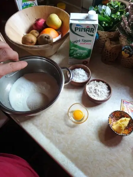 - Öncelikle muhallebi için gerekli olan süt, un, nişasta, yumurta sarısı ve şekeri tencereye alalım.Eki Görüntüle 2118020 Eki Görüntüle 2118019 Çırpıcı ile karıştırarak koyulaşıp kaynayıncaya kadar pişirelim.