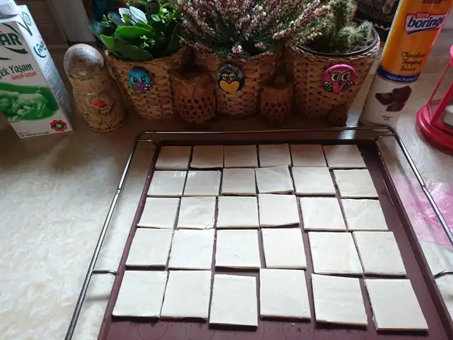- Daha sonra her bir kareyi 4 küçük kareye bölelim. Dilerseniz kare yerine çay bardağı ile keserek daireler de elde edebilirsiniz. Şekil olarak güzel oluyor. Ancak kenarlardan kesilen fazla parçalar israf oluyor diye düşünebilirsiniz. Bu yüzden tercih size kalmış :)Eki Görüntüle 2118031