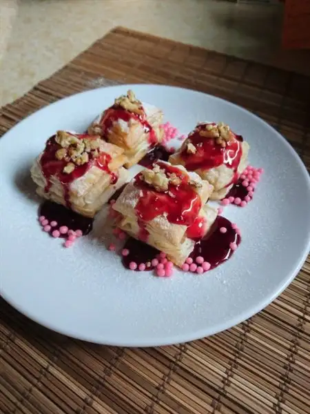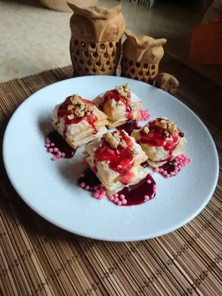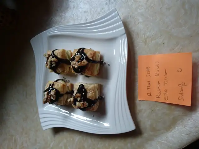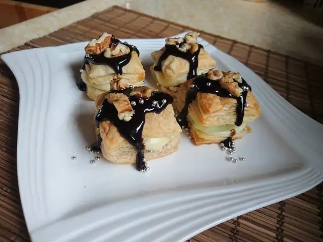 - Hazırladığımız milföy pastalarını servis tabağına alalım.Eki Görüntüle 2118059 Üzerlerini pudra şekeri veya çikolata sosu ile süsleyelim. Dilerseniz hemen veya bence birkaç saat dinlendirdikten sonra servis yapabilirsiniz, şimdiden afiyet olsun :)