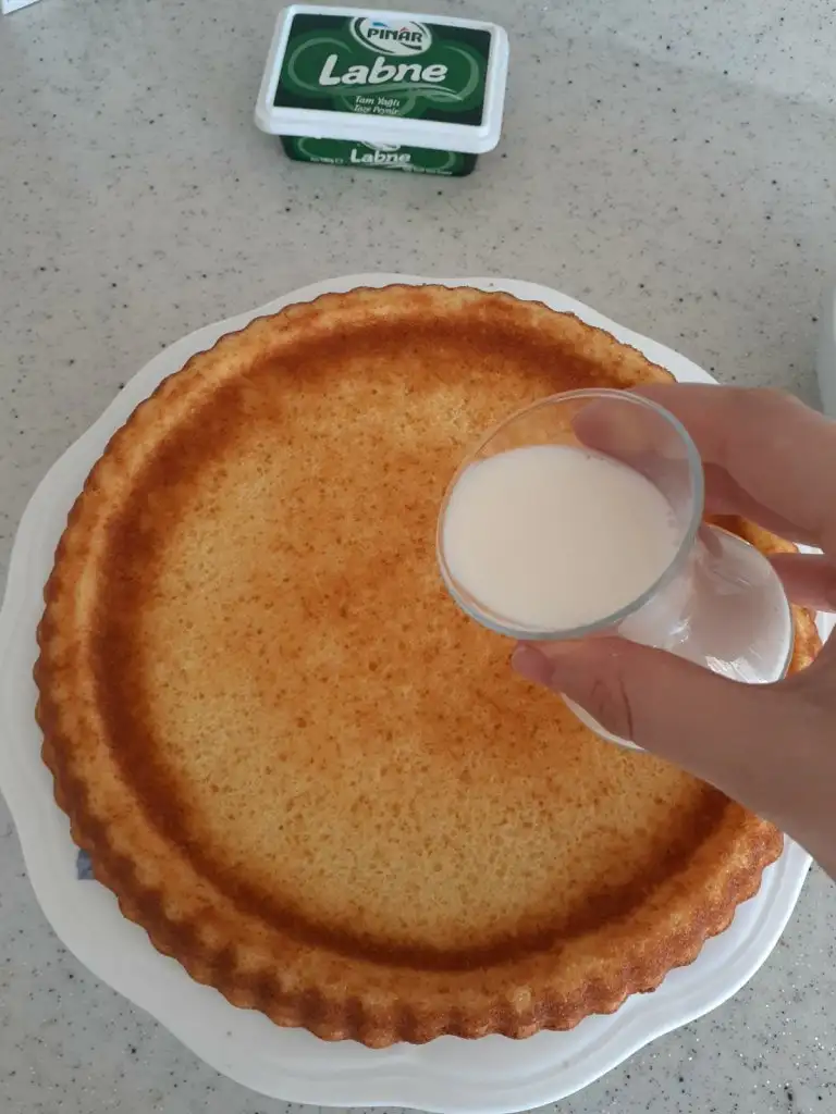 Kek pişip ilk sıcaklığı çıktıktan sonra 1 cay bardagi süt ile ıslatıyoruz. Sonra muhallebiyi dökebiliriz.Eki Görüntüle 2831263 Eki Görüntüle 2831264