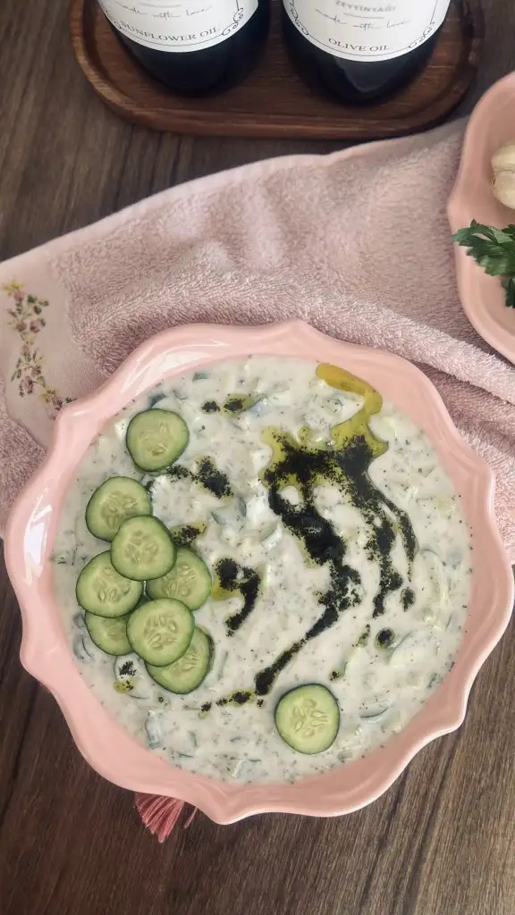 Salatalıkları doğruyoruz. Yoğurtla karıştırıyoruz. Tuz ve sarımsağı ekliyoruz. İsteğe göre zeytinyağında nane kızdırıp servis edebiliriz.