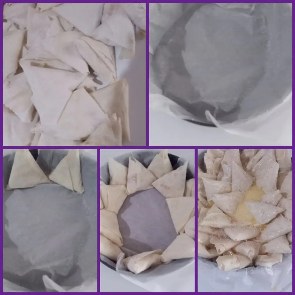 Yufkalarımızı 5,6 cm genişliğinde uzun şeritler halinde kesip, hazırladığımız harçtan koyup muska şeklinde sarıyoruz.Bütün yufkaları bu şekilde sarıp bitirdikten sonra kenarlarını yağlayıp tabanına yağlı kağıt serilmiş 25 cm lik kalıbımıza tek tek yerleştiriyoruz.