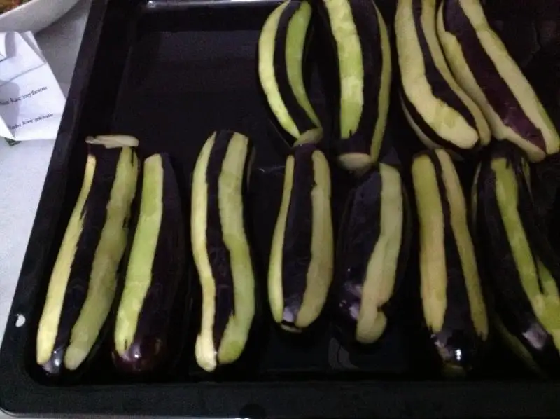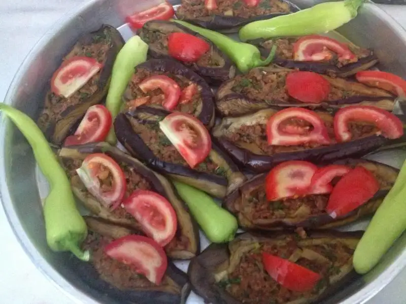 patlıcanların içini açıp hazırladığımız kıymayla dolduruyoruz domates biberle birlikte tepmsiye dizip üzerine 1 bardak suyu bırakıp. Suyunu cekekene kadar pişiriyoruz