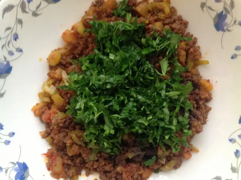 Sonrada soğan biberi koyup kavurup ardından salçasını ve domadesi koyup kavuruyoruz bir kapa alıp ılıyınca baharatını ve maydanozunu koyup karıştırıyoruz