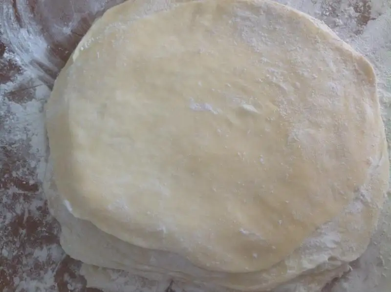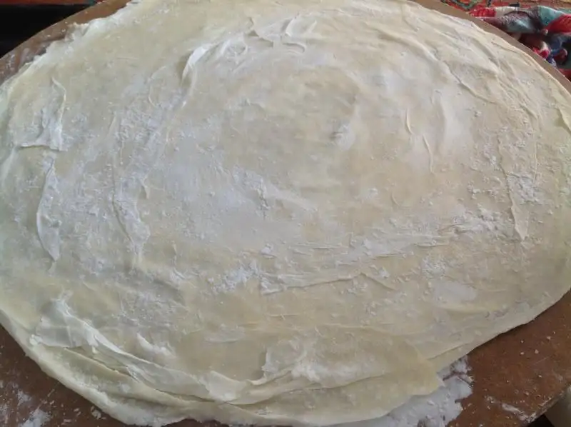 Bu hamurları 10 tanesini nişasta serpip 1 tabak büyüklüğünde merdane yardımıyla açıp aralarına tekrar nişasta serpip üstüste diziyoruz