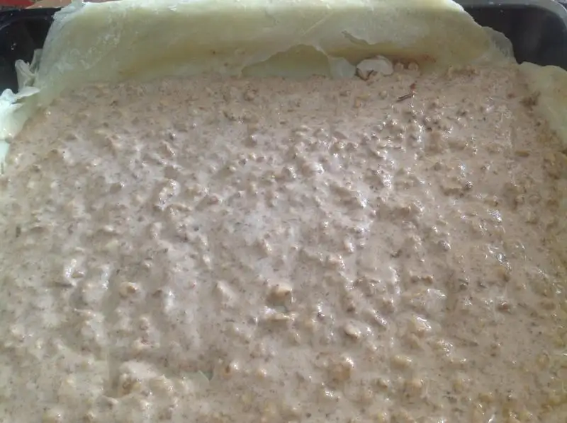 Yufkayı tepsiye serip eğer fazlaysa kenarlarını kesiyoruz Sonrada kek karışımını yufkanın üzerine yayıyoruz