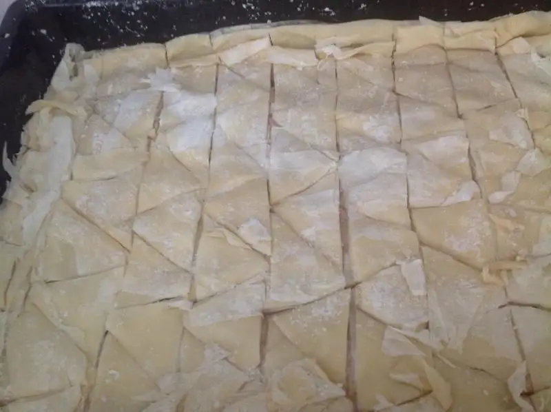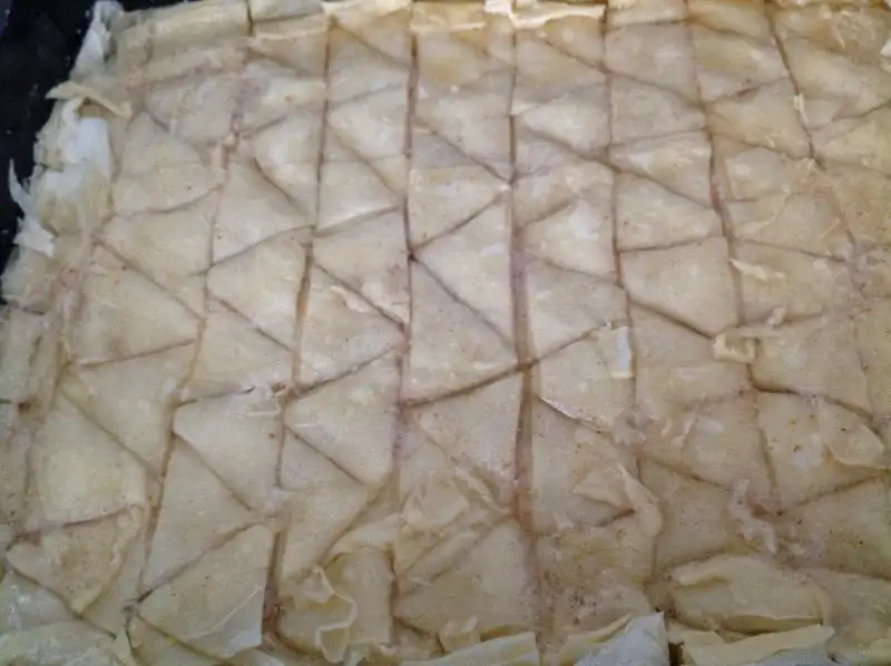 Diğer kalan 10 parça hamuruda aynı şekilde açıp kekin üzerine serip fazla gelen kenarlarını kesiyoruz ben ziyan olmasın diye tepsinin ortasına koyup öyle kestim sonrada baklavamızı kesiyoruz