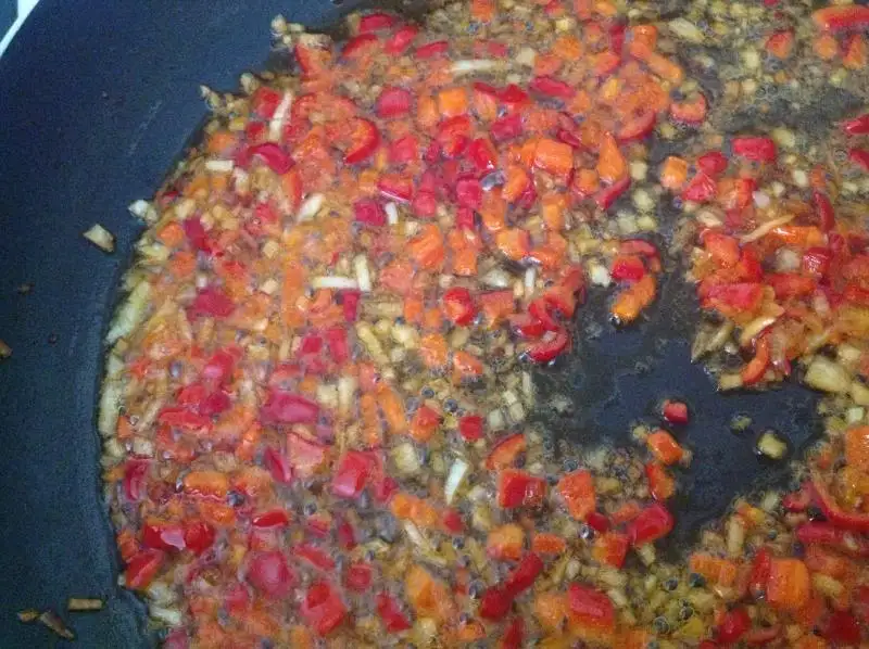 Önce yağı tavaya alıyoruzsora 10 dakkika önce buzluktan cıkardığımız soğanları tavaya alıp kavuruyoruz arkasından kırmızı biberleri koyup kavuruyoruz