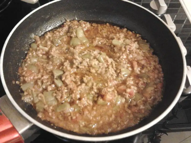 pişip suyunu tamamen çeken kıymamıza ince ince doğradığımız yeşil biberleri ve küp küp doğranan soğanları ekleyip çok azda sıvıyağ ekleyip biberler ve soğanlar ölene kadar kavuruyoruz