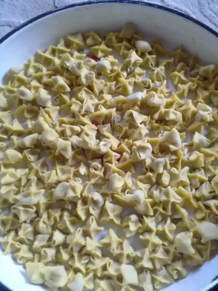 mantıları yapıp bittikten sonra fırında yaklaşık 10 dakka kadar kurumaya bırakıyoruz...pişmeyecek sadece kuruması için...