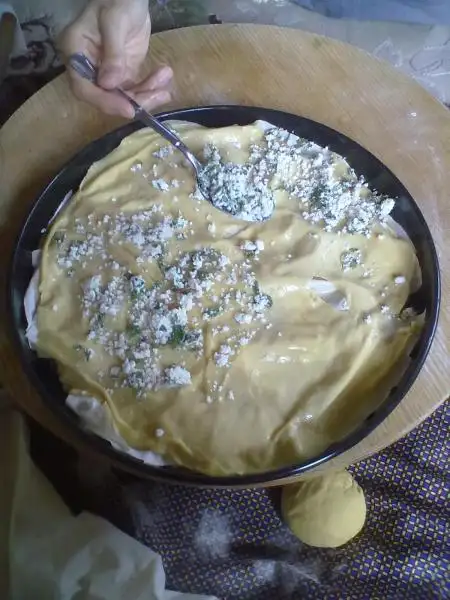 tepsiyi yağlayıp yufkaları döşüyoruz, her yufka arasına sıvı yağ sürüyoruz ki ıslak olan yufkalar birbirine yapışmasın..3 kat döşeyince peynirli maydonozlu içi döküp, sonra kalan 3 yufkayıda aynı etaplardan geçirip döşüyoruz aralarını yağlayarak...